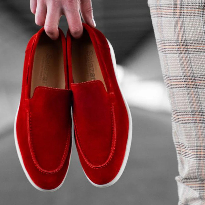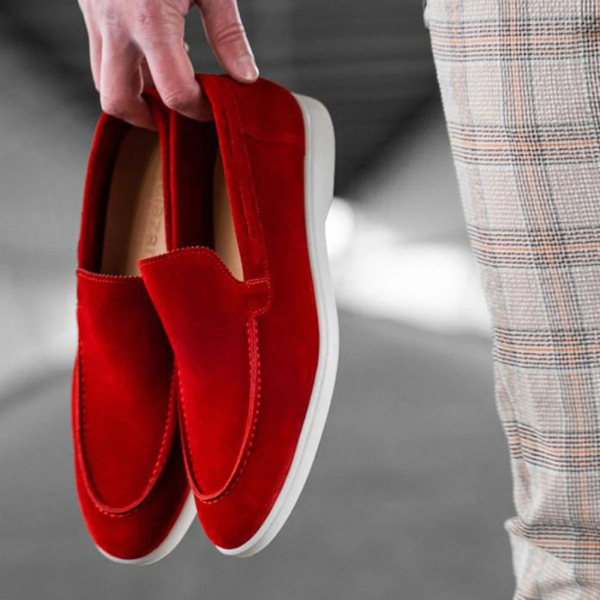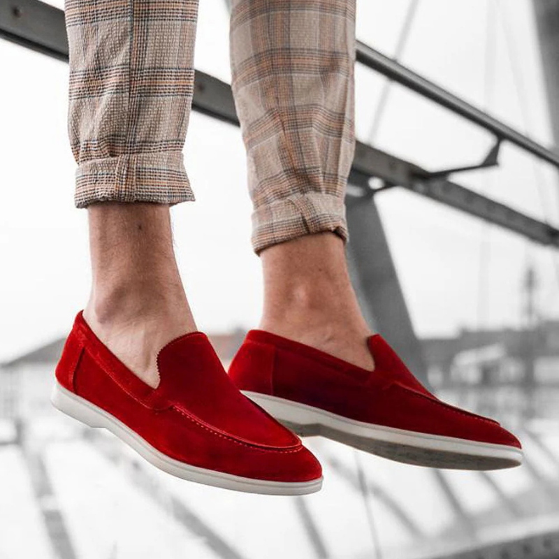 Mocassins rouge en Daim cuir véritable, design et style chic. Design mocassin suédine moderne, avec semelle type basket sneakers pour plus de confort, chaussures homme habillé. Semelle blanche fine matière caoutchouc.